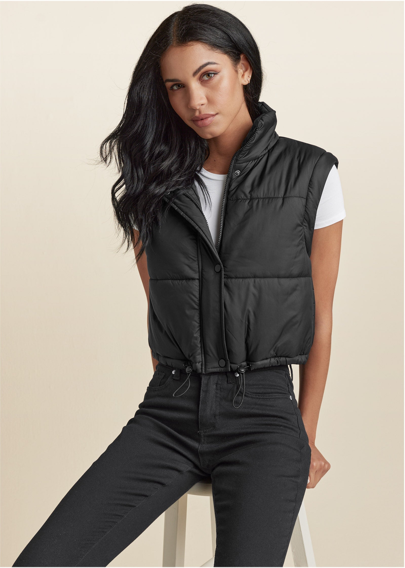 The puff piece your cool-weather outfits have been looking for. This cropped puffer jacket has an adjustable drawstring waist for a custom fit. Removable sleeves make this layer work double duty as a vest and a jacket depending on what your outfit calls for. Pair with high-rise bottoms for a meet-and-greet look.